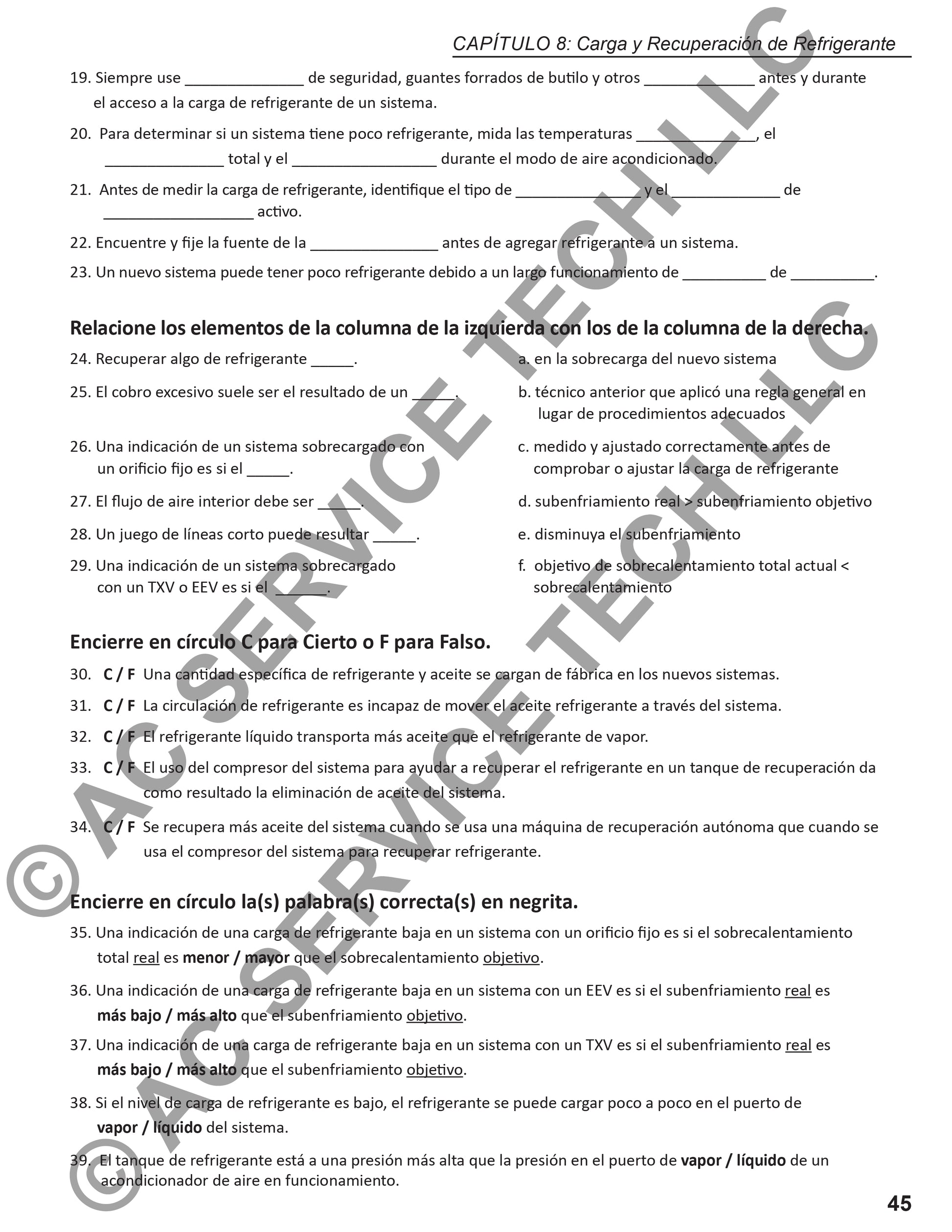 Este cuaderno de ejercicios es un complemento directo del texto de “Procedimientos de Carga y Servicio de Refrigerante para Aire Acondicionado (2ª Edición)”. Este cuaderno de ejercicios sigue el texto capitulo, proporcianado más de 1,600 preguntas y problemas de apoyo para poner a prueba su comprensión de los diversos procedimietos, métodos y pasos establecidos en el libro. Este cuaderno de ejercicios también puede ayudar a los lectores a retener información como el ciclo de refrigeración y los componentes utilizados en cada sistema. Las imágenes personalizadas se utilizan para mostrar escenarios de carga y solución de problemas.